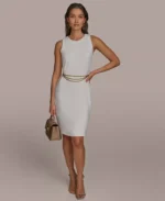 - Jewel neckline; Sheath silhouette